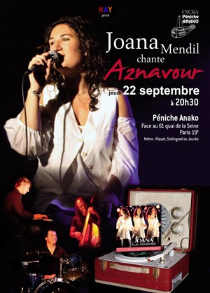Après des passages dans différentes salles, elle a décidé de poursuivre la 7e saison de son spectacle "Joana Mendil chante Aznavour" dans la chaleureuse ambiance de la péniche Anako le jeudi 22 septembre 2016. Elle vous fera voyager sur sa planète Aznavour, entourée de son trio jazz. Elle vous fera découvrir ou redécouvrir les histoires simples du grand Charles avec l'éclairage Joana.