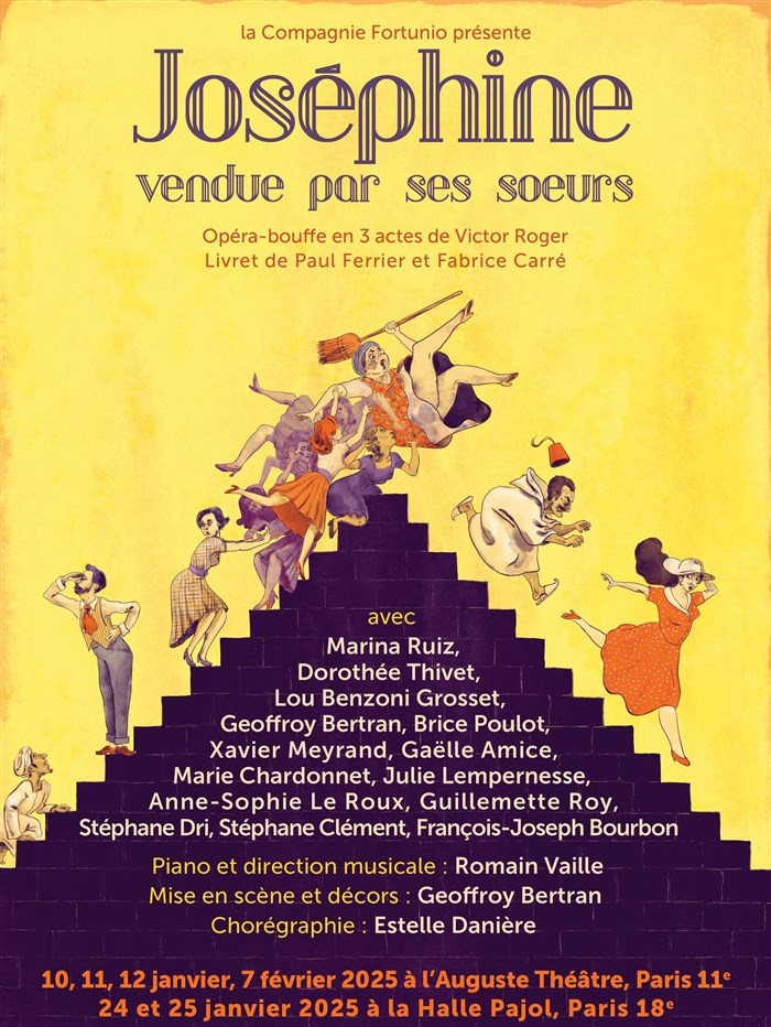 Opéra-bouffe en 3 actes de Victor Roger présenté par la compagnie Fortunio avec des Artistes lyriques de très haute volée,musiciens, chanteurs,comédiens...La merveilleuse Estelle Danière(passage en revue)en assuré les chorégraphies.Un enchantement avec des artistes qui chantent et jouent à merveille.C'était un petit bijou de drôlerie avec un pianiste et une flûtiste dissimulés derrière le rideau .Putiphar, Alfred Pacha,mère Jacob,Benjamine et Joséphine mais tous et toutes... nous ont vraiment fait voyager et tout oublier, le soucis, le mauvais temps.