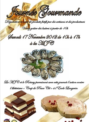La Journée Gourmande est un marché de produits locaux pour la plupart (huitres, foie gras, escargots, charcuterie, fromage d'Ardèche, vin, pains spéciaux, chocolats, macarons, pains d'épices, miels, confitures...) mais aussi une exposition d'artistes peintres locaux, bijoux fantaisie, livres de cuisine, huile d'argan, savons d'argan...)