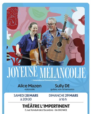 Joyeuse mélancolie est un tour de chant sensible et vibrant porté par Sully De, auteur-compositeur à la guitare, à l'harmonica et à la voix, accompagné de la violoncelliste Alice Mazen, musicienne d'exception.