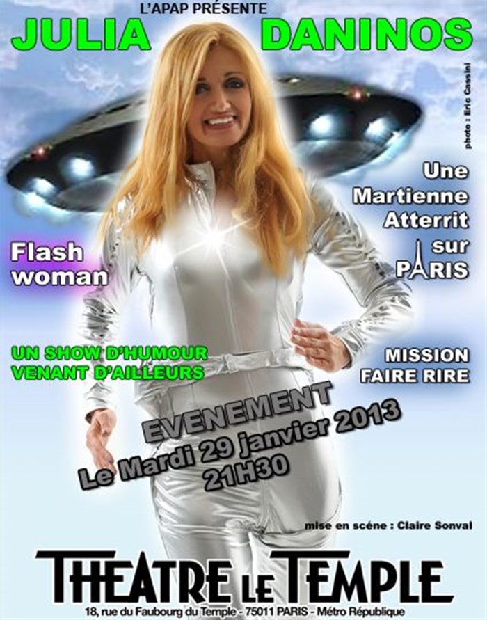 Quand une Martienne atterrit sur Paris, cela ne passe pas inaperçu. Rencontre du 3e type ou rencontre tout bonnement insolite. Voici un spectacle innocent qui rappelle le Cabaret d'antan. Qu'elles soient parlées, chantées ou dansées, Julia Daninos va droit au but avec ses histoires. Sa galerie de vêtements et d'accessoires illumine la scène. Il faut bien avouer que Julia n'est pas en reste côté excentricité. Elle tire de ses effets comiques toute l'attention du public. Et ces chansonnettes sont ouvertes à tous les plaisirs. Julia est apparue l'espace d'un seul soir mais son souvenir est bien ancré dans ma mémoire.
