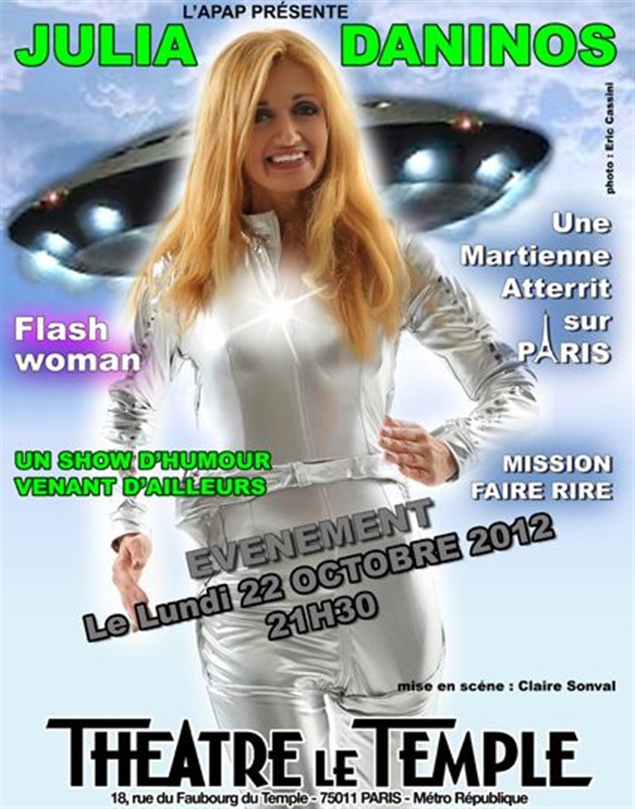 Une "Martienne" débarque sur la Capitale... A chaque Flash telle une Flash Woman en Frégoli (Culture de son Père, Jean-Daniel Daninos, qui est Scénariste et Réalisateur de plusieurs films plébiscités : notamment "Un Martien à Paris" avec Darry Cowl), elle s'incarne et s'identifie à des personnages terriens en plusieurs sketches et change de costumes par magie.
