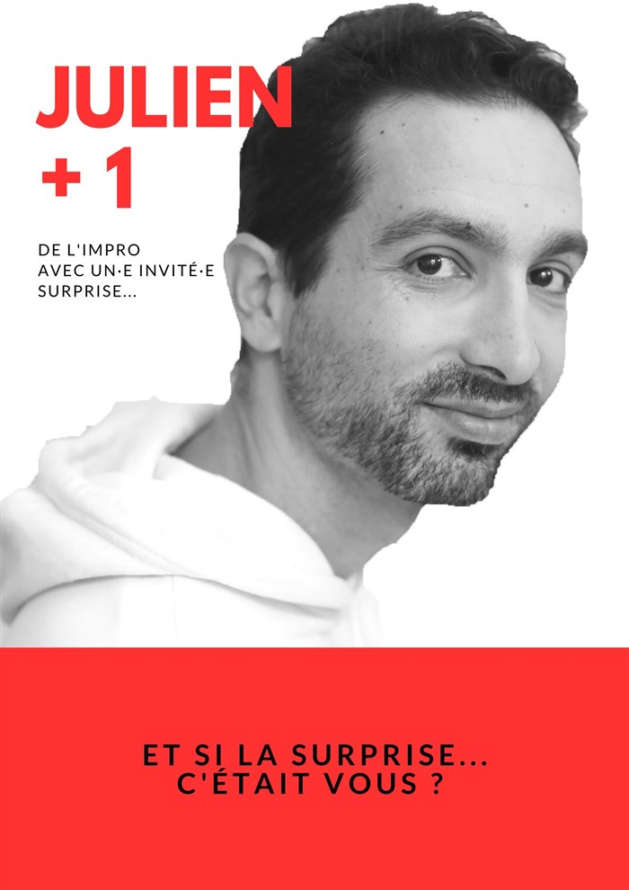 Julien +1 est un spectacle d'impro avec deux acteurs : Julien et... Un membre du public choisi au hasard, pour l'occasion invité sur scène et star du spectacle !