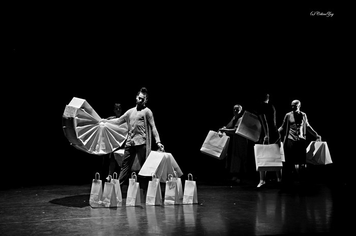 Une création qui tourne autour de thèmes très actuels:questions de productivité, culte de la profusion d'objets inutiles et de la communication non communicante.