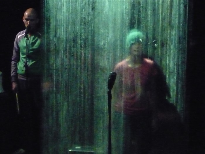 Au plateau : 2 comédiens, 1 violoncelliste, des micros, 2 amplis.