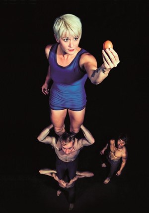 3 hommes et une petite femme défient les lois de la gravité 1 oeuf, 1000 portés, 15 000 spectateurs déjà debout pour applaudir ce nouveau cirque.