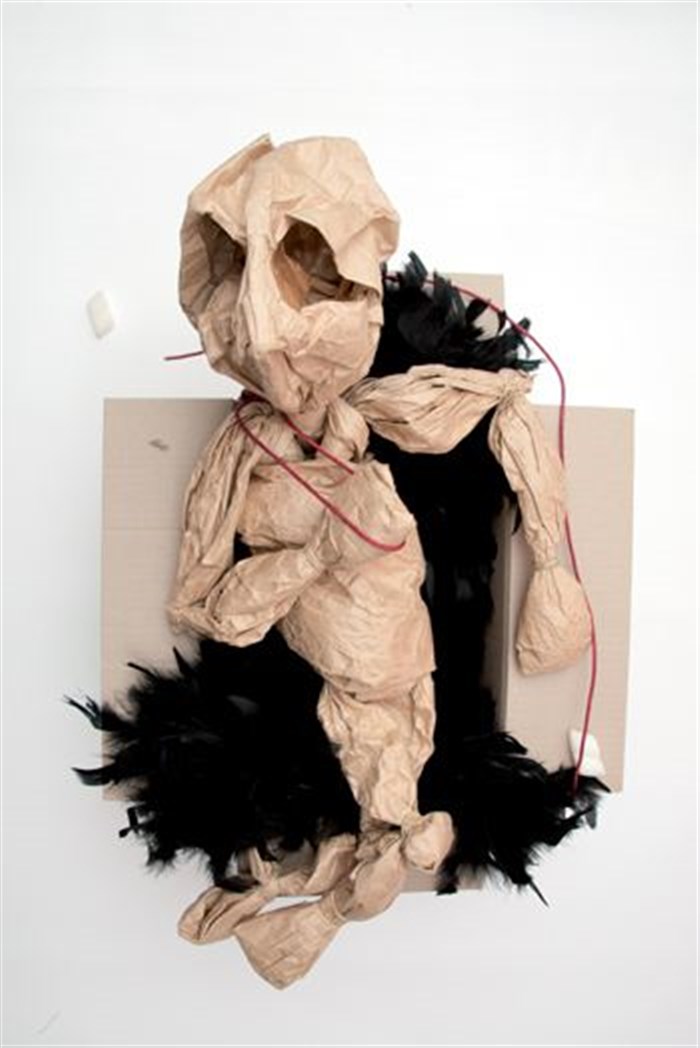 Cinq interprètes entrent en scène, accompagnés de rouleaux de papier Kraft. De ces grandes bandes de papier surgit une effigie aux allures humaines, un "bonhomme", légèrement plus grand que les quatre acteurs qui le manipulent à vue.