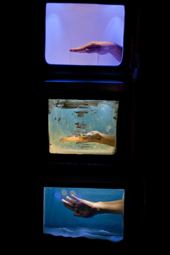 " L'aire glacière " est une pièce visuelle et chorégraphique pour quatre mains, dans des glacières de picnic vides et devenues pour l'occasion castelets ou écrans