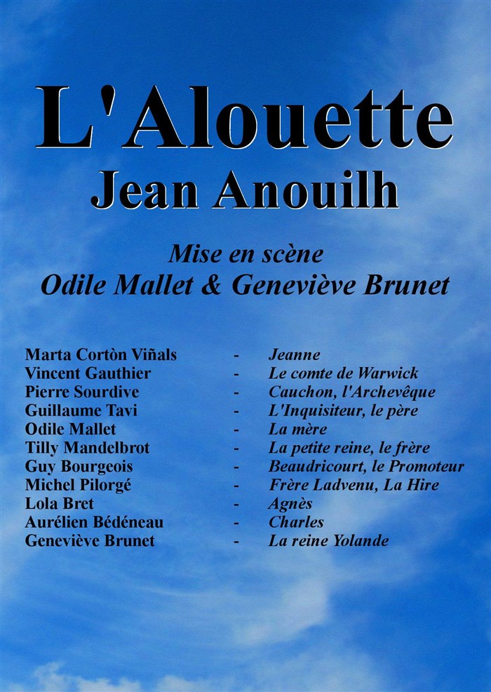 Une des plus belles pièces d'Anouilh, mêlant fantaisie et gravité, mise en scène intelligemment dans un décor très sobre : que des chaises et bien sûr pas d'époque, mais on oublie cet anachronisme pour se concentrer sur le drame humain et spirituel. Drame brillamment interprété dans l'ensemble, par des comédiens qui, jouant parfois 2 emplois, passent aisément de l'un à l'autre. Mention spéciale pour les deux rôles les plus difficiles : La Pucelle, dont la passion évoque Antigone, autre personnage d'Anouilh, sans qu'on sente le stéréotype, grâce à la dimension spirituelle qui s'y ajoute et au jeu très varié et "sincère" de la comédienne (Martha Corton Viñals). Le roi Charles VII : parfaitement incarné par Aurélien Bédéneau dans sa complexité, à laquelle s'ajoutent les bouffonneries que lui prête Anouilh (le fou du roi, c'est le roi lui-même ?).