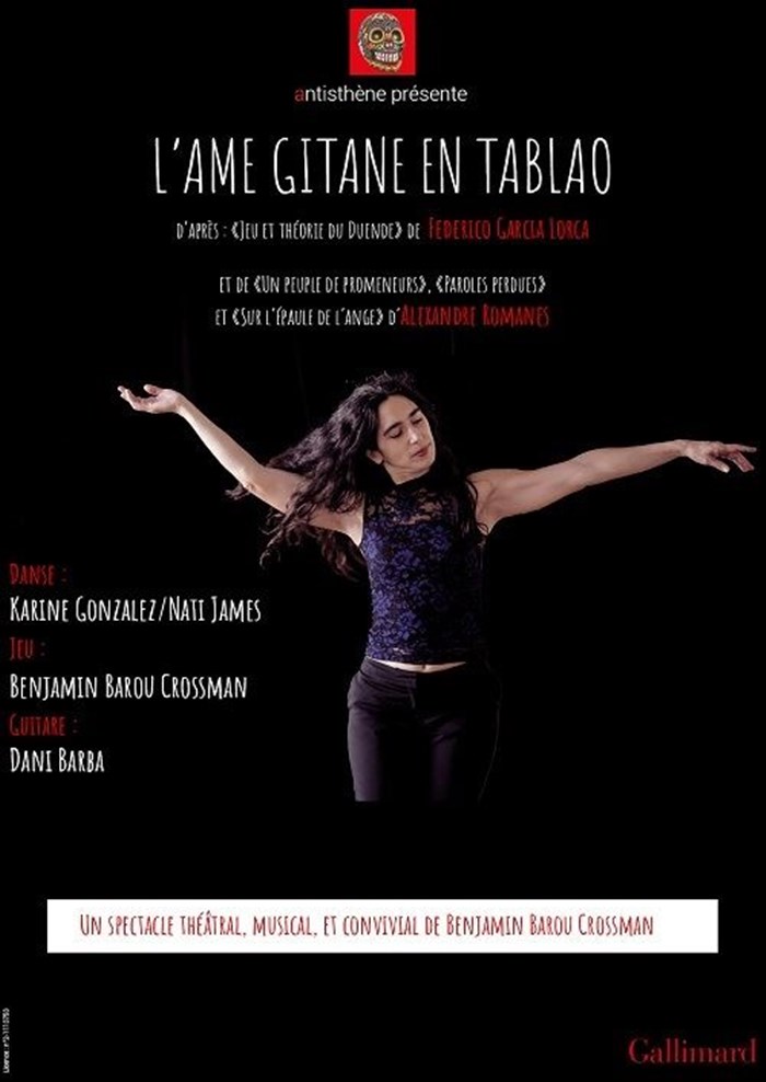 L'Âme Gitane en Tablao " est une performance poétique et musicale qui prône la liberté, l'art et l'amour... Entre les poèmes de Garcia Lorca ou ceux d'Alexandre Romanes, la danseuse flamenco s'empare de la piste pour partager de grands moments de danse et d'improvisation, le guitariste se lance dans des solos virtuoses et le comédien partage son vécu avec la communauté gitane.