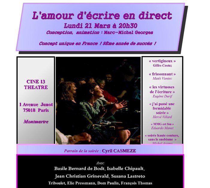Marc-Michel Georges, réussit son pari depuis 9 ans, de faire spectacle avec l'écriture. C'est original, convivial, un peu fou et nulle part ailleurs.