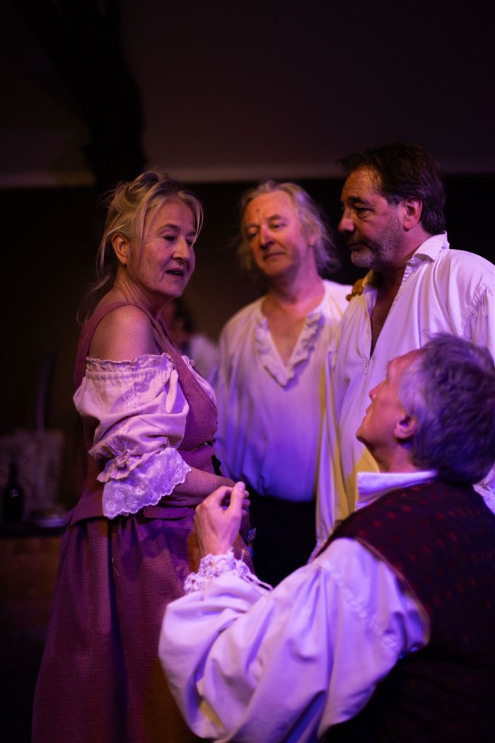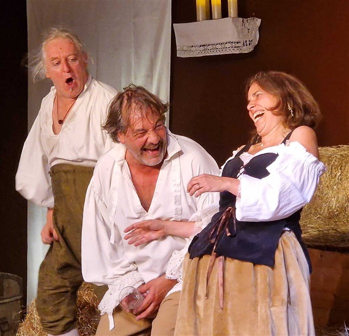 Sur scène, dans la fraîcheur d'une grange, Molière et quelques uns de ses compagnons de troupe se reposent et déjeunent d'un simple repas arrosé de vin.