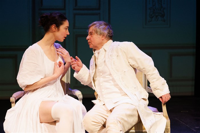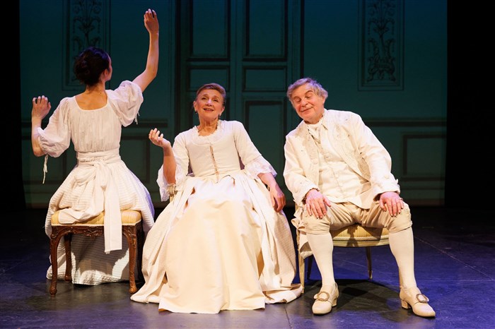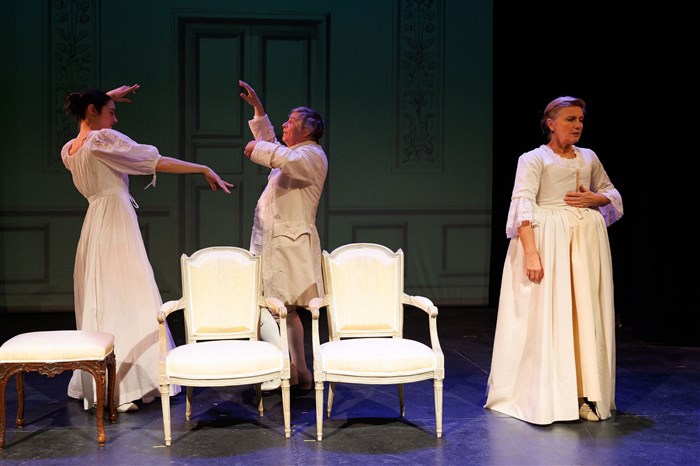 Marie du Deffand à la fois acerbe et digne ; Marguerite Mousset, une Julie de Lespinasse aussi candide que retorse ; Rémy Jouvin, un président Hénault fidèle au portrait qu’en faisait d’Argenson, « au-dessous de l’insolence et au-des- sus de la bassesse », trop fin pour prendre parti entre ces deux femmes de tête. Deux chaises, un tabouret et des costumes, que Jérôme Ragon semble avoir empruntés à Greuze, suffisent à camper l’ambiance de cette antichambre, où se font et défont les complots d’un monde, quand le don des femmes se mesurait à leur art de recevoir. (Catherine Robert)