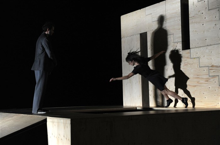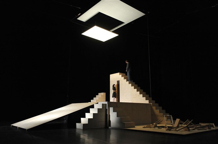 Les deux personnages se démêlent dans leur quotidien qui évolue tout comme la scénographie les emporte, et nous avec, vers des espaces où tout repaire est oublié.