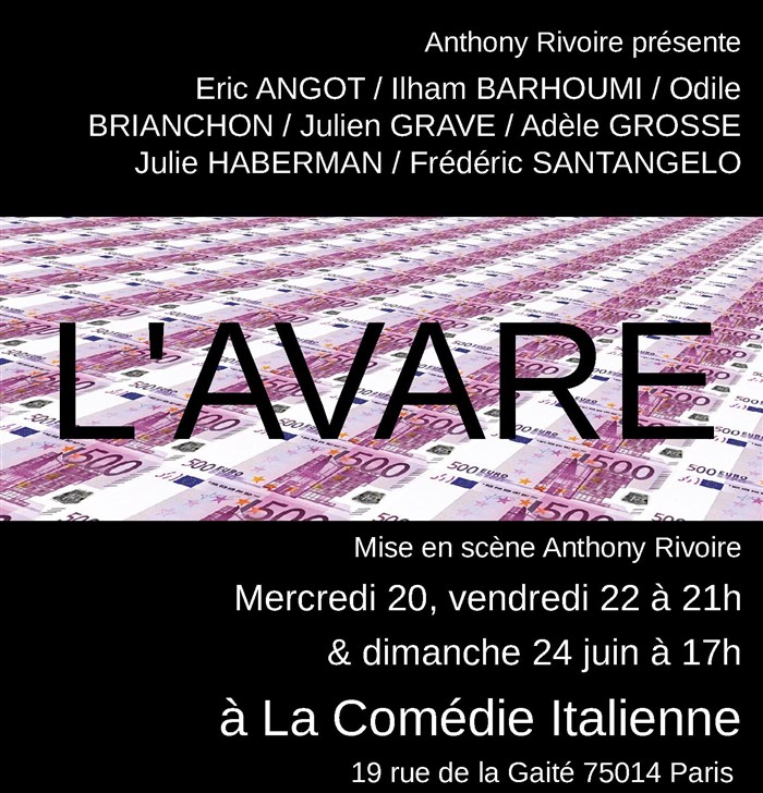 Harpagon, riche et très avare, a un fils, Cléante, et une fille, Élise, qui ne l'estiment guère. Élise aime Valérie, qui s'est introduite chez Harpagon comme intendante. Cléante est amoureux de Mariane, jeune fille sans dot. Mais l'intrigante Frosine mène une négociation pour la marier à Harpagon. Celui-ci soupçonne un lien entre Cléante et Mariane et feint de renoncer à l'épouser en raison de son âge. Cléante est confondu et s'oppose violemment à son père, qui découvre soudain la disparition d'une cassette contenant son trésor, qu'il avait enterrée dans le jardin. Les soupçons se portent sur Valérie...
