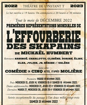 Tu veux savoir ce qu’ont pensé les spectateurs et la presse de cet événement : L'effourberie des Skapains - Théâtre Instant T ? Découvre leurs avis éclairés et prépare-toi à vivre un moment d’exception à ton tour en réservant tes places !