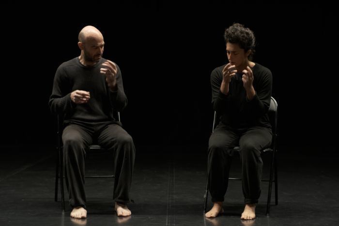 Deux chaises. Deux corps assis sous une lumière crue. Leurs mains palpitent, tricotent l'espace, se bagarrent. Des gestes mécaniques, entravés, obstinés qui s'étirent sur une musique que l'on connaît par coeur.
