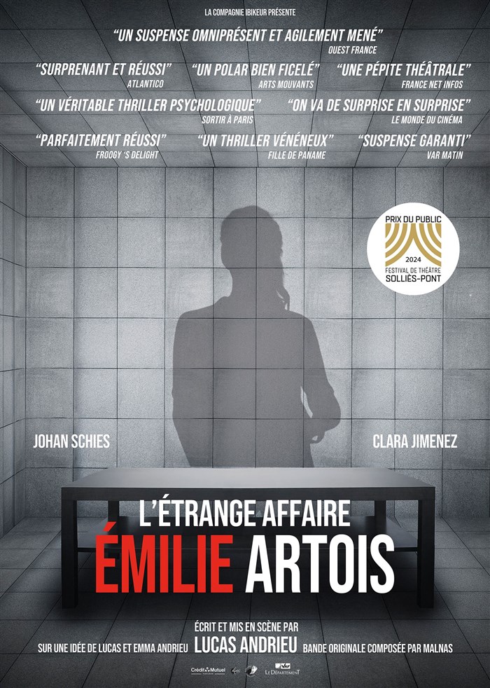 Je le dis tout simplement : le jeune auteur Lucas Andrieu est de la dimension des futurs très grands auteurs dont on parlera. Retenez bien ce nom : Lucas Andrieu. Il est déjà grand. A 28 ans. Il est habité. Et hyper doué. Son oeuvre 'l'étrange affaire Emilie D'Artois est inouïe. L'écriture... différente ! De la trempe des immenses auteurs du théâtre classique et contemporain : de celle qui apporte cette autre indéfinissable dimension qui s'appelle le talent. Et le texte est servi par deux excellents comédiens. A voir impérativement et pouvoir dire : j'y étais.
