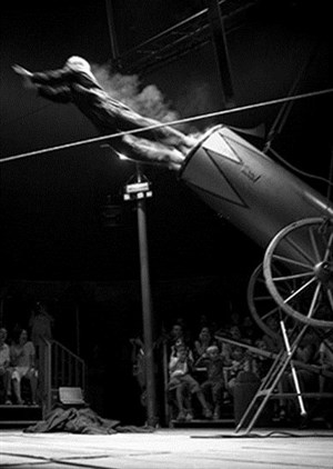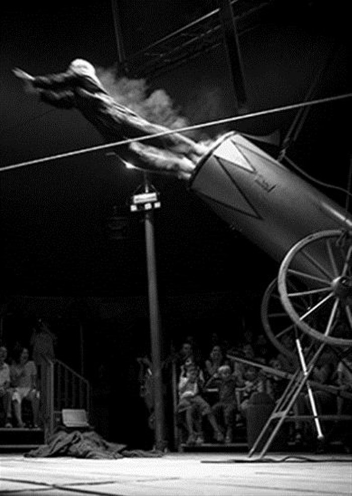 Un tête-à-tête convivial avec le divertissement singulier, le pur, le vrai, sans coulisses. L'homme marche sur un fil en jouant de la trompette, vole d'une bascule en jouant de l'accordéon, se fait projeter dans les airs par un canon. Il mène tout le spectacle, du début à la fin, en solo, avec seulement son humour et son incroyable énergie. Rien ne l'arrête, même pas la toile du chapiteau. En cadeau, car l'homme est extrêmement généreux, un final qui restera gravé dans la plus myope des rétines...