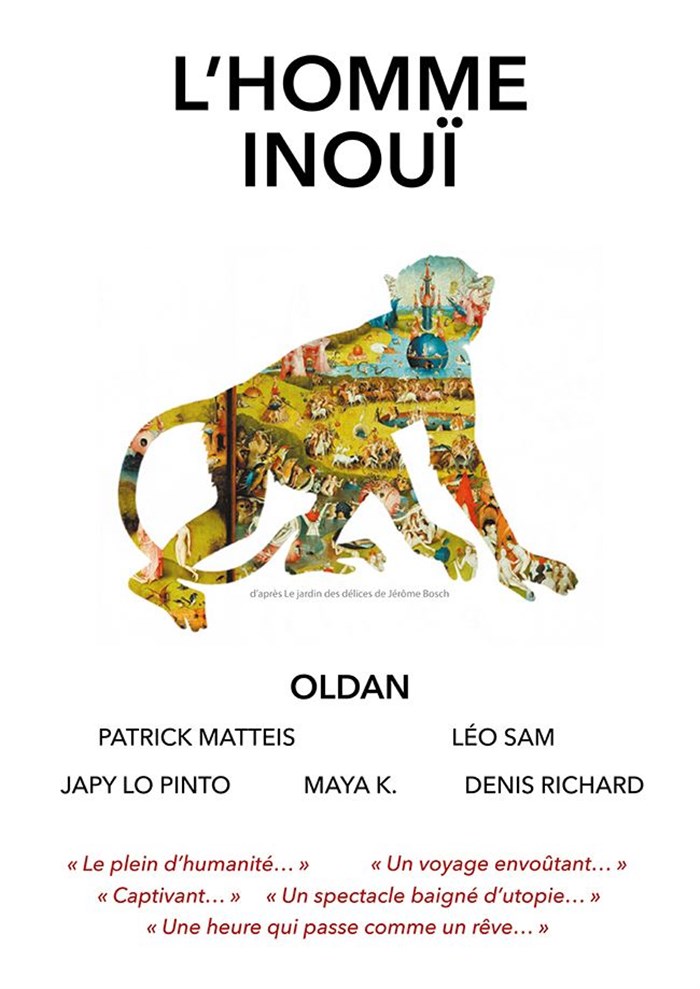 Mêlant adresses au public, monologues, chansons, musiques, dessins et peintures, ce spectacle emprunte à la tradition du barde l'art et la manière de captiver un cercle d'invités au cours d'une soirée, comme une veillée au coin du feu. Soirée envoutante et onirique, nourrie de révélations, de questions ou de récits, colorée de musiques et d'images projetées. Étonnant spectacle qui rappelle les genres théâtraux ancestraux que sont la rhapsodie et la chanson de geste où l'aède conte et chante, louange et dénonce les récits de vie qui le touchent, nous proposant de découvrir le sien au travers d'un labyrinthe merveilleux auquel il nous invite à nous perdre. Ces formes anciennes reprises avec force et une certaine violence feront le lot des " performances " des Seventies. Elles se retrouvent aujourd'hui réinvesties par des poètes, des comédiens, des musiciens et des plasticiens, parfois un peu tout ça à la fois, souvent agrémentées d'improvisations aux élans d'Happening. Cela ressemble bien à ça L'HOMME INOUÏ. Cela pourrait bien être notre barde d'un soir, cet Oldan qui sait être chaleureux et meurtri, touché et touchant, regorgeant d'empathie et d'altruisme. Oldan nous accueille debout sur le plateau, le dos tourné, nous laissant nous installer dans une ambiance sonore électroacoustique, façon zen tendance musique psychédélique des Sixties. La musique est jouée par Patrick Matteis (qui en est le compositeur) aux manettes d'un clavier-synthétiseur intriguant, ressemblant à une boite noire en carton décorée de boutons de métal, mais ce n'est pas ça du tout, j'en suis sûr. Une guitare est posée à côté de lui, attendant son tour. Un tabouret aussi. Au sol, un cercle lumineux. Un écran de tissu blanc en fond de scène où sera projetée la stupéfiante création vidéo réalisée par Léo Sam, faite d'images arrêtées et des fondus mouvants sur des fragments de tableaux de Jérôme Bosch. Puis Oldan se retourne, nous regarde, nous salue, nous félicite. Il commence une étrange et audacieuse danse de mots, de propos, de chansons, de sons et de notes, d'images posées ou mouvantes. Entrant et sortant du cercle lumineux comme s'il s'agissait de symboliser le " hors " et le " dans " de son personnage. Captivante harmonie de voix parlée ou chantée, de bruissements mélodiques ou de scansions veloutées, de couleurs impressionnantes s'échappant des regards d'un singe, des figures anthropomorphes étirées jusqu'à montrer leur monstruosité ou posées là, parmi d'autres détails du " portement de croix " ou du " jardin des délices " de Jérôme Bosch, entre autres. Le texte d'Oldan nous interpelle. Simple, poétique, imagé, il balance son chaland de la candeur à la douleur pour nous parler d'amour, de désir et de plaisir. Pour nous montrer la peine et les méfaits que nous et les autres charrions dans nos vies. Sans jamais perdre tout à fait son cap fait de son crédo et de sa rébellion, Oldan nous parle de l'indispensable quête du bonheur. Avant et malgré tout. Un spectacle rare comme toute expérience théâtrale inhabituelle et réussie. Un parcours de rêveries et de réflexions, baigné d'utopie, au charme élégant du poète.
