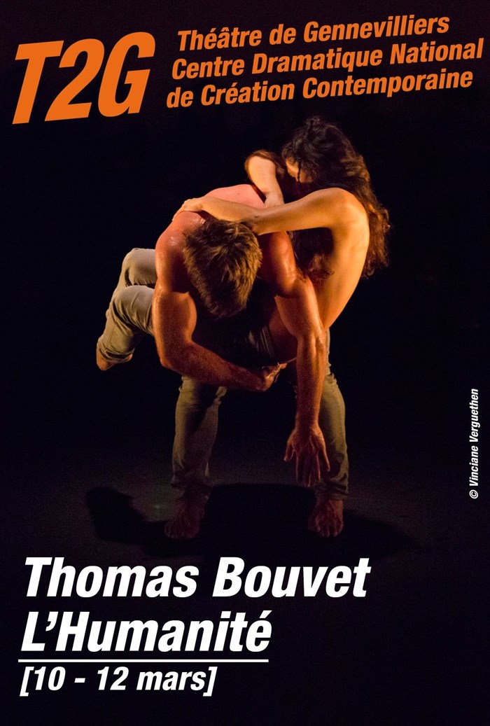 Dans L'Humanité Thomas Bouvet confronte danseurs et comédiens pour à partir d'un dialogue âpre et intense entre les mots et les corps créer une expérience sensorielle et charnelle traduisant au plus près la vivacité inouïe de la langue du poète et dramaturge allemand August Stramm.