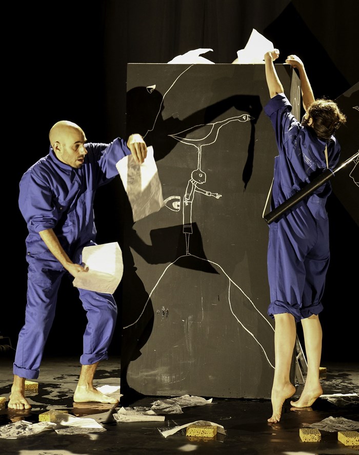 Deux baladins tombés du ciel suivent une ligne sans fin dont le trait dessiné ouvre vos imaginaires... pour se sentir pousser des ailes.