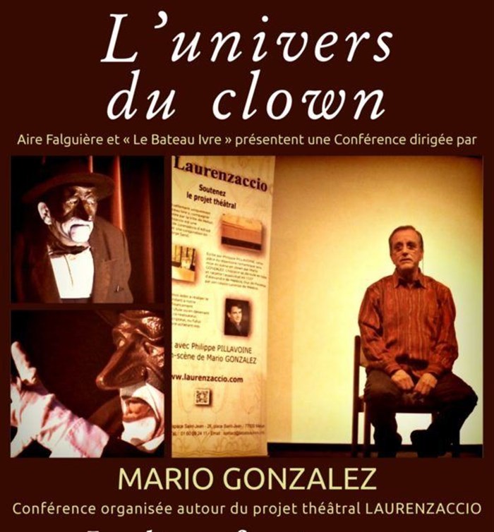 Dans le cadre du projet théâtral " Laurenzaccio " Aire Falguière et " Le Bateau Ivre " présentent Mario Gonzalez dans sa Conférence " L'univers du clown ". Pendant une heure trente il va vous parler de son univers de clowns qu'il imagine, construit et donne vie depuis son enfance.