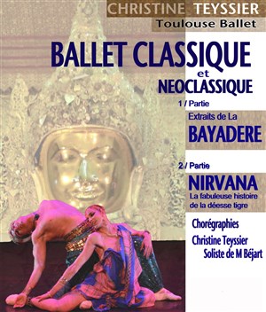 La Cie Toulouse Ballet dirigée par Christine Teyssier soliste de Maurice Béjart, ses spectacles ne cessent de remporter de francs succès auprès d'un public de plus en plus nombreux. Présentation en première partie des extraits du ballet classique " La Bayadère " et " Nirvana " son dernier spectacle la fabuleuse histoire de la déesse tigre, sur le thème de l'Inde des croyances, et des mythes, sur des couleurs musicales variées et nouvelle influence, Hip Hop, indien... des beaux costumes, bijoux...