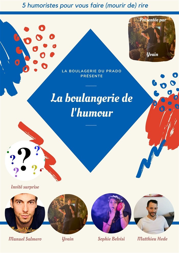 5 humoristes vont se relayer sur la scène de la Boulangerie du Prado pour vous faire passer une soirée sous le signe du rire et de la bonne humeur.