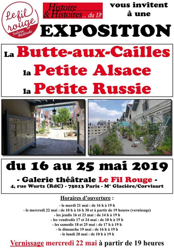 La galerie théâtrale Le Fil Rouge et la revue Histoire & Histoires du 13e vous invitent à une exposition intitulée " La Butte-aux-Cailles, la Petite Alsace, la Petite Russie ".