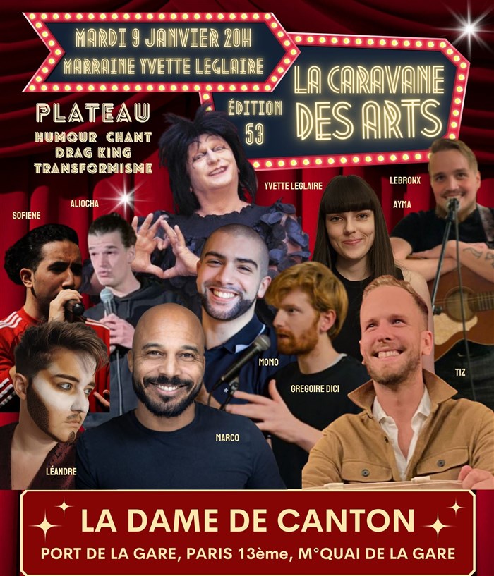 Pour sa 53ème Edition, La Caravane des Arts, plateau pluridisciplinaire, largue les amarres à la Dame de Canton et vous propose une programmation toujours aussi éclectique (chant, humour, drag king, transformisme) et riche. Chaque artiste vous présentera tour à tour un extrait de son univers.