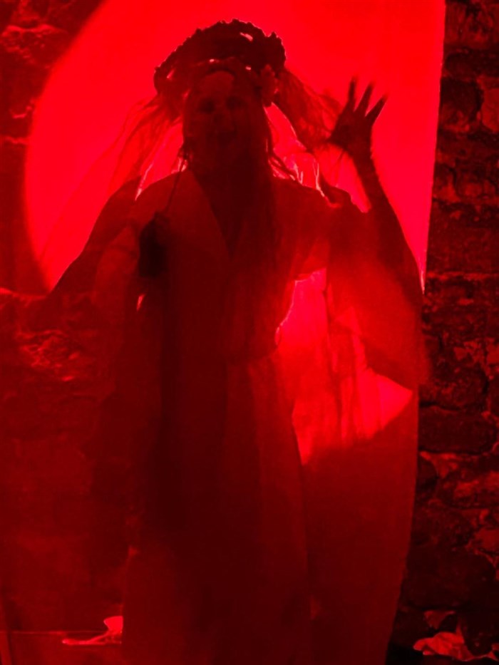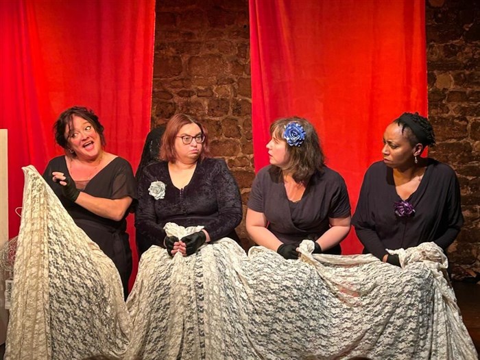 Stéphanie Fumex met en scène, avec humour et poésie, un drame puissant, qui porte aujourd’hui encore toute sa nécessité d’être raconté. Dans une mise en scène dynamique, qui convoque la marionnette et les jeux de lumières poétiques, la pièce explore ces désirs refoulés. Se marier ou ne pas se marier, vouloir simplement être aimée, être libre et partir. La mère en marionnette, figure de la répréhension, se voit être interprétée tour à tour par chacune des comédiennes et trône au centre de la scène telle une menace constante. Mais dans ce décor rougeoyant, obscur et symbolique, une volonté générale d’émancipation et de liberté se dessine, puissante et radicale. Par cette phrase provocatrice, la pièce prend tout son sens : « Naître femme est le plus grand des châtiments ». . Monstrueuses, sournoises, compétitrices, chacune des femmes dépeintes poursuivent leurs désirs, prêtes à tous les sacrifices. Tout au long de la pièce, la rébellion plane au-dessus de la maison, annoncée fatale par une apparition fantomatique…