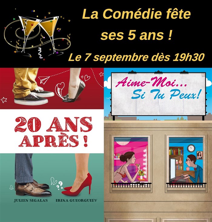 Une soirée exceptionnelle pour fêter les cinq ans de la comédie de Grenoble. Deux comédies et un apéritif. Une soirée conviviale et festive.