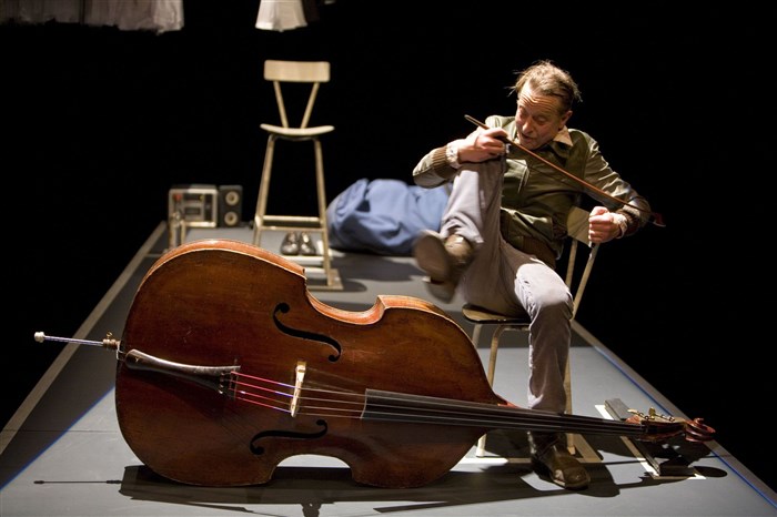 Sa diction transforme le texte en partition jazzy ; il éructe le texte, il caresse la contrebasse, il en fait sortir de drôles de sons martelés. Son corps se tord, il chante ( très bien ) Schubert. Musicien-clown solitaire et dérisoire. La mise en scène subtile de Natascha Rudolf propose un spectacle sombre et très original. "