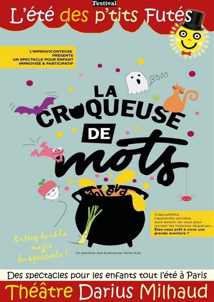 " La Croqueuse de mots " vous est présenté dans le cadre du festival parisien de spectacles jeune public " L'été des p'tits futés " organisé par le Théâtre Darius Milhaud. Entrez dans la magie du spectacle !