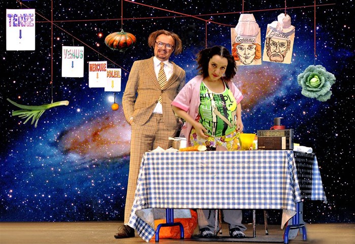 Le Professeur Beuz assisté de Madame Pozzoni, duo de clowns, font visiter aux enfants le cosmos et revivre la formation de l'Univers, la création des étoiles et du système solaire.