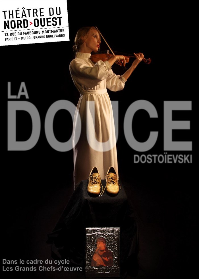 Soirée intimiste au théâtre du Nord-Ouest pour la première de La Douce de Dostoievski avec Guillaume Tavi et Chloe Dunn formant sur scène un couple russe tourmenté. La particulière exaltation des sentiments propre à l'âme slave est rendue par la mise en scène épurée et efficace d'Emilie Sandre et par la finesse du jeu des deux acteurs. Prouesses du (presque) sosie de Patrick Dewaere, dont le corps donne corps à la souffrance du mari, dont les expressions et les mots reflètent le paroxysme des maux; une présence de Chloe Dunn à la fois forte et toute en finesse. Une phrase baudelairienne pour vous inviter à goûter au spectacle : mon coeur mis à nu