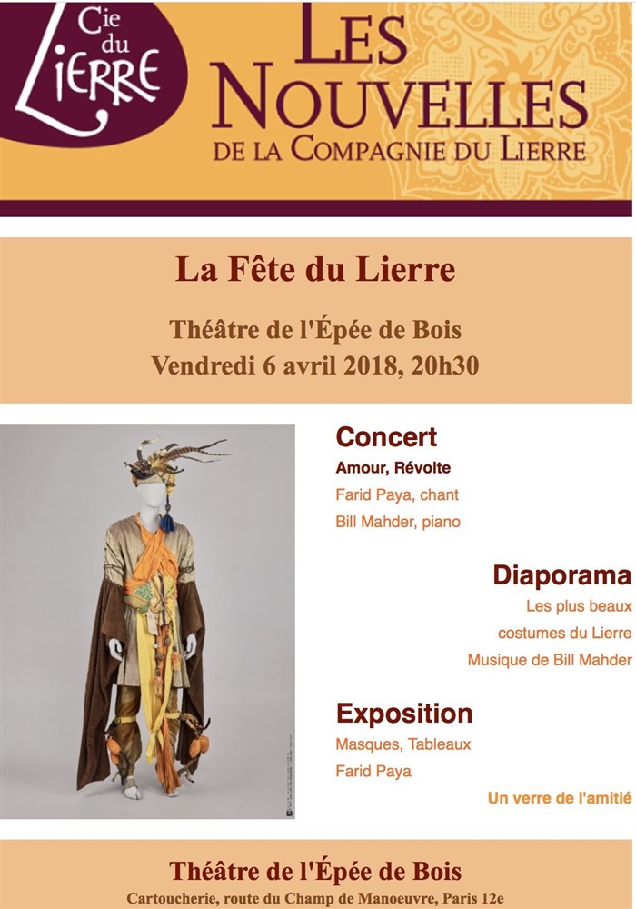 Farid Paya et la Cie du Lierre vous invitent à une fête où il y aura un concert, la projection d'un diaporama, une exposition et un verre de l'amitié.