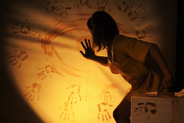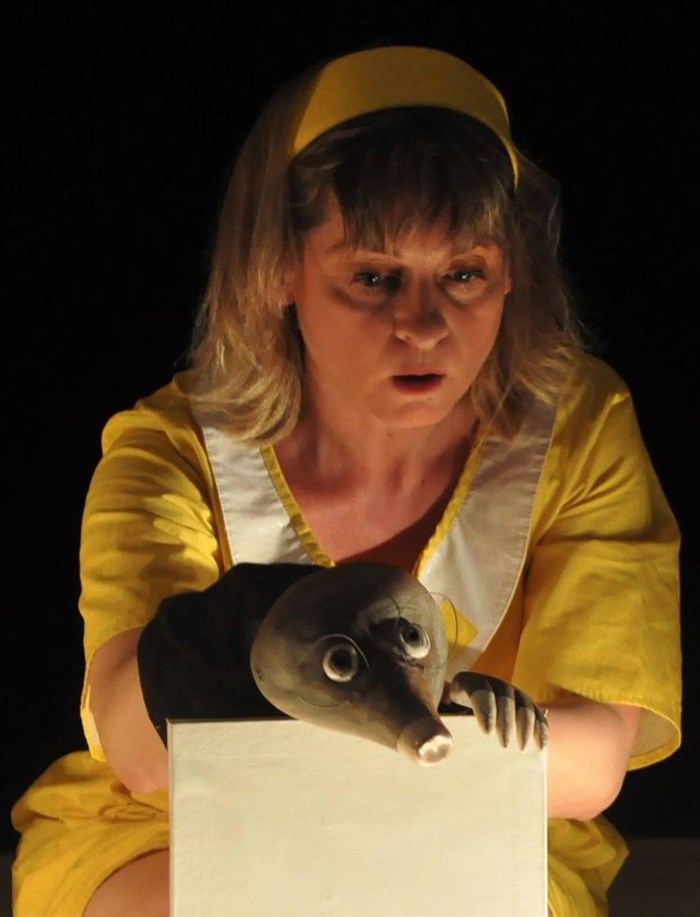 Au tout début, le bruit de la terre résonne, étonne. Un cadeau est laissé sur scène. On traverse le temps et nous voici chez la femme en jaune qui patine gaiement dans son intérieur tout blanc. Elle découvre le cadeau : de la terre... Alors... Elle creuse, trifouille, farfouille. Elle découvre le contact avec la terre, son odeur, sa texture. On peut transformer cette matière. Elle y ajoute un peu d'eau et comme par magie, les formes apparaissent.