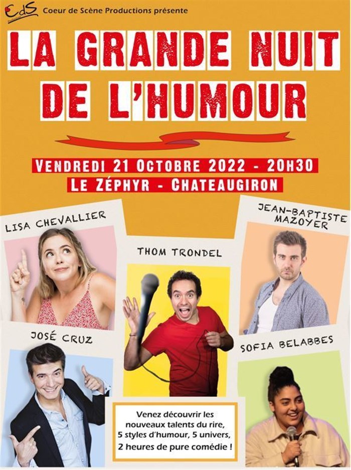 L’événement La Grande Nuit de l'Humour | Châteaugiron de type Plateau d'humoristes, organisé ici : Le Zéphyr - Châteaugiron, n'est plus disponible à la vente.