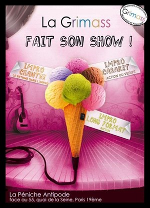 La grimass fait son show est un mezzé de 3 spectacles en un seul : cabaret d'impro, pièce de théâtre improvisée, concert de chansons improvisées.