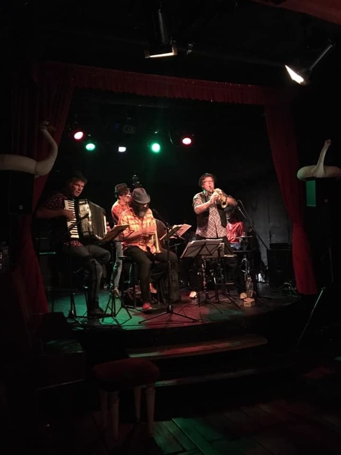 Guinguette nomade, des bords de Marne jazzy au Foro du Brésil en passant par les rythmes des Antilles ou la folie des Balkans, emmenée par 5 musiciens au plaisir communicatif. Tout ce qui chaloupe et chavire peut sortir de la musette, clarinette, trompette, accordéon, contrebasse, batterie...