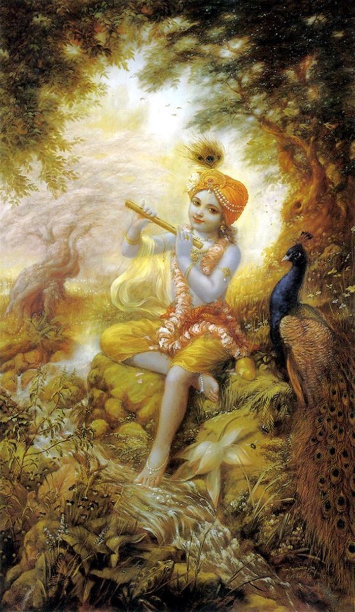 Sitôt né, l'enfant Krishna se joue des humains en de multiples exploits révélant sa divinité. Nul ne résiste au charme de ses mélodies qui appellent à l'amour les animaux et la nature, et aussi les jolies bergères, dont la belle Radha.