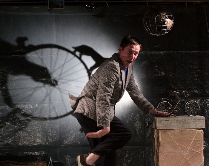 Pour raconter son périple, l'étranger, dans une langue que personne ne comprend, se transporte dans un univers de ferraille et de manivelles et manipule un bric-à-brac ludique et dérisoire.