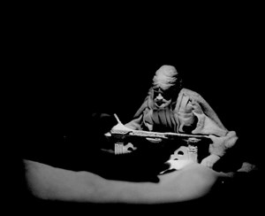 Face à l'unique spectateur, une lucarne ; derrière la lucarne, le minuscule rideau de scène. Le montreur de marionnettes, invisible et calfeutré dans son théâtre, commence la narration d'une parabole muette dont le geste seul des poupées définit l'évolution du drame dans un temps et un espace que l'on pourrait dénommer sacré ou métaphysique: cette "miniature" semble parler et transmettre un message du fond des âges et agir au plus profond de l'esprit du spectateur, là où règnent silence et tranquillité réelle, loin du quotidien et de la vanité de ses agitations.
