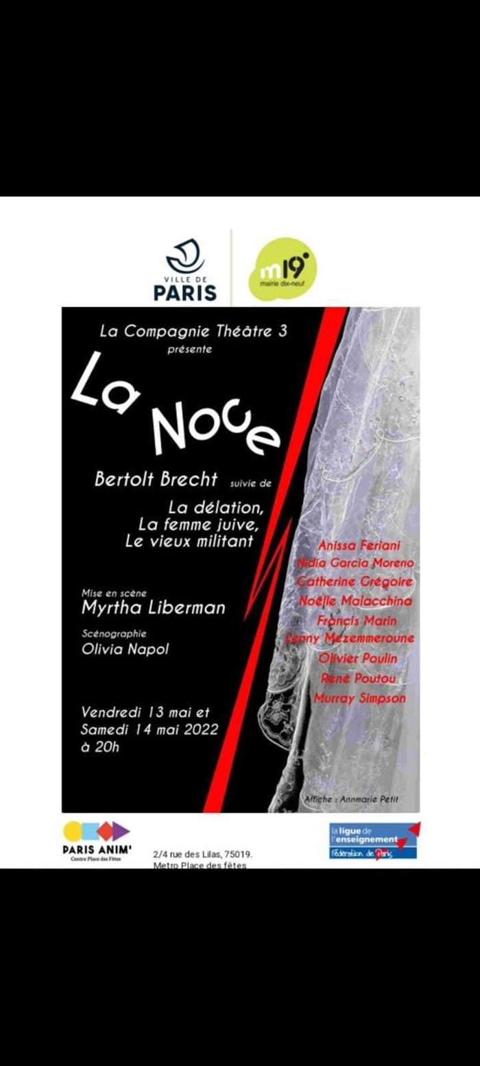 Nous avons adoré la mise en scène très inspirée, les répliques du jeune Brecht hilarantes, l'engagement des acteurs ( mention spéciale pour Anissa Feriani). On ne s'ennuie pas une seconde. L'ajout d'autres textes de Brecht en deuxième partie donne une profondeur supplémentaire au propos de La Noce. Bravo. Je recommande