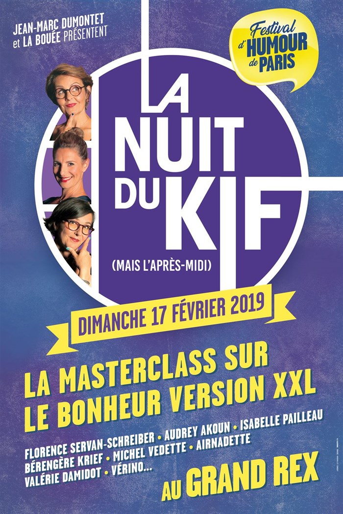 Avec La nuit du Kif, le Festival d'humour de Paris vous propose une soirée unique. Nos trois papesses de la psychologie positive nous embarquent pour un show exceptionnel avec des guests de folie et plein de surprises pour encore plus de partage, encore plus d'humour et encore plus de bonheur.