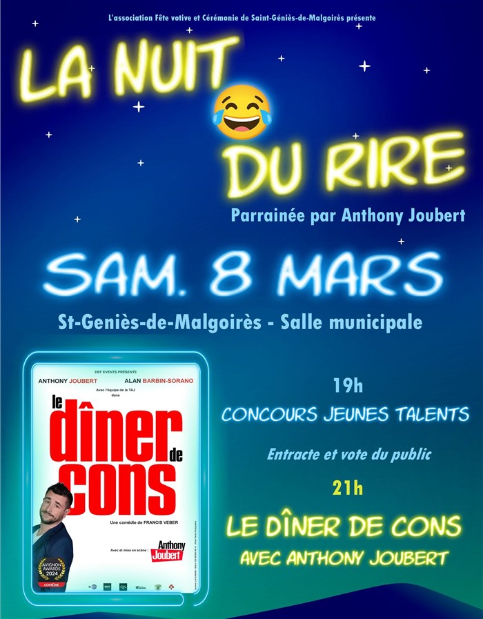 La Nuit du Rire avec la comédie "Le Dîner de cons" avec Anthony Joubert mais aussi un concours Jeunes Talents. Un soirée de rires à découvrir !