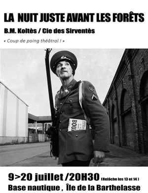 La Nuit Juste Avant les Forêts est l'un des plus beaux monologues du répertoire contemporain... Ce texte brut, poétique, ironique et écorché a été écrit en 1977. Il conserve une actualité déconcertante, en résonance avec cette certaine atmosphère, où l'on questionne l'identité par le biais du rejet et de la haine. Jouer " La nuit... " dans la rue, avec la rue, est une " sacrée manière douce " de rendre ce texte à la ville.