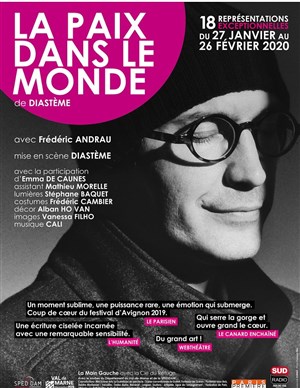 Simon aime Lucie. Depuis 107 ou peut-être mille ans. Pourtant, le voici depuis quinze longues années dans une institution en Suisse où il tente de guérir après avoir commis un acte fou. Simon a peur du monde, peur de lui faire du mal. Il n'a plus besoin de se scarifier, son coeur est déjà en mille morceaux. Et puis, un jour, par la grâce d'un ordinateur, il retrouve Lucie. Leur histoire peut-elle reprendre où elle s'est tragiquement arrêtée ? Avec "La Paix dans le Monde", Diastème clôt le triptyque de Simon et Lucie ("La nuit du thermomètre" et "107 ans"). Compte-tenu du climat de l'époque, il aurait pu opter pour le bruit et la fureur qui auraient fait voler en éclats toutes les conventions d'un monde exacerbé par les tensions et les conflits. Mais non ! Jamais pièce n'aura aussi bien porté son nom : le texte est transcendé par un comédien exceptionnel, Frédéric Andrau, dans un rôle qui lui colle à l'âme. Tout en nuances, il restitue mezza-voce les états d'âmes de Simon, raconte, dialogue, établit des perspectives dans l'espace et le temps, reconstruit le pont vers l'autre rive, celle des rêves qui peuvent enfin se réaliser. La mise en scène de Diastème est d'une exemplaire sobriété : un pavé amovible devient tour à tour chambre, table ou paravent, permettant de reconstituer les différents espaces qui environnent Simon mais aussi délimite son propre espace mental. Seules la vidéo (Emma de Caunes reprend son rôle de Lucie) et la musique exquise de Cali apportent quelques touches extérieures à cette rédemption amoureuse. "La Paix dans le Monde" est oeuvre de résilience mais aussi d'amour fou jusqu'à la mort, aussi belle et lointaine soit-elle. Simon déclame Euripide et récite Claudel qui n'aimait guère les surréalistes. Il n'est pourtant pas interdit de penser que si Breton avait assisté à la représentation, il n'ait ressenti le même sentiment qu'à la sortie de "Peter Ibbetson" : un émerveillement absolu. Mais il est un écrivain, militant de l'amour et de la paix, dont Diastème suit les pas dans ce beau texte, le désespoir mis à part. Jusque dans le visuel de l'affiche, Frédéric (Simon) Andrau a quelque chose de Stefan Zweig et de son humanisme invétéré. L'écrivain autrichien n'écrivait-il pas à la fin de "Lettre d'une inconnue" : "Il sentit que quelqu'un venait de mourir ; il sentit qu'il y avait eu là un immortel amour : au plus profond de son âme, quelque chose s'épanouit, et il eut pour l'amante invisible une pensée aussi immatérielle et aussi passionnée que pour une musique lointaine."